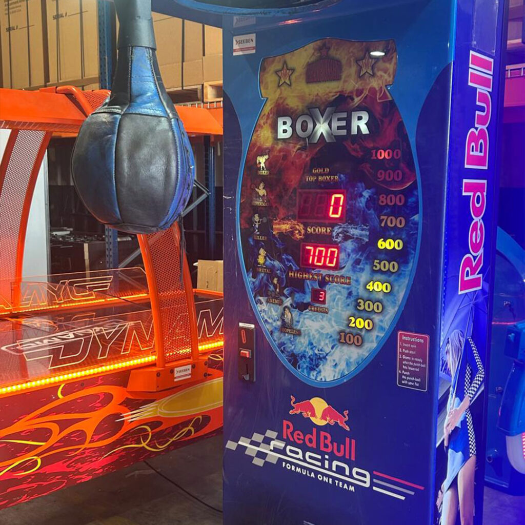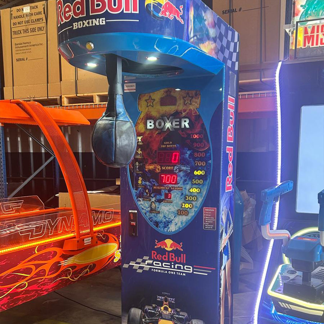 Le Boxer Red Bull est une machine de frappe qui combine défi physique, esprit de compétition et forte visibilité. Grâce à son branding officiel Red Bull, cette borne attire immédiatement l’attention et s’impose comme un véritable pôle d’animation dans les salles de jeux, centres de loisirs, bars et événements.